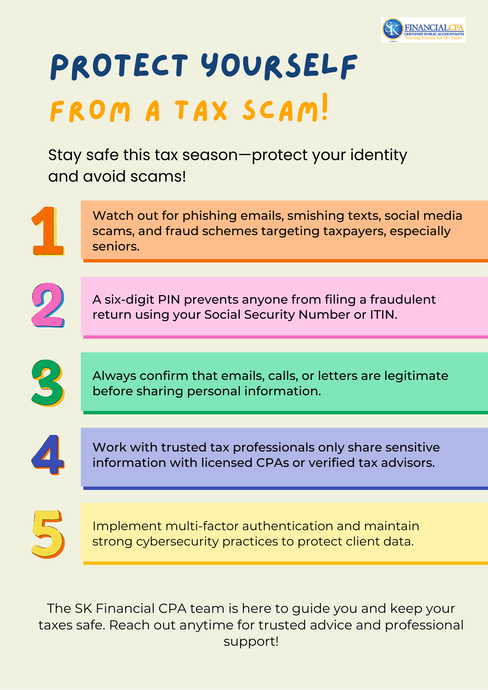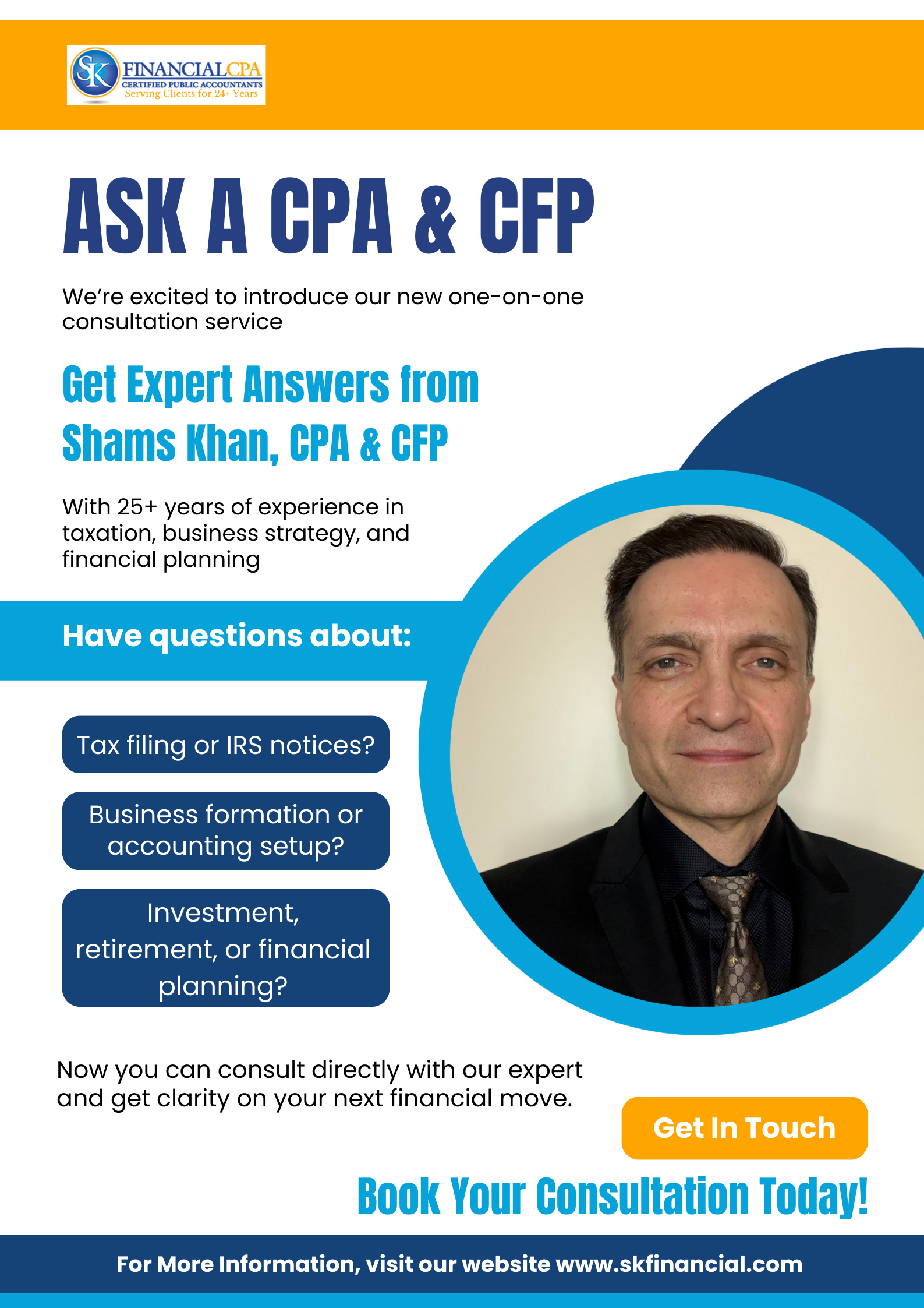At SK Financial CPA, we provide tax services for individuals ($275) and businesses ($650), including filing and strategic planning to help you save more. For more details, visit the IRS Filing Season Resources and track refunds through Where’s My Refund?