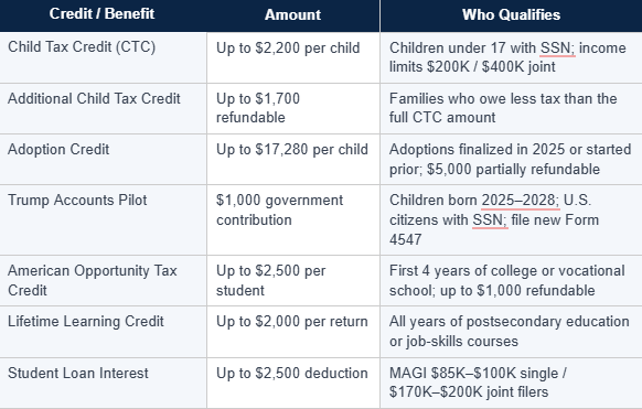 Several enhanced credits and a brand-new pilot program are available for the 2025 tax year. Here is a summary of what applies to you and your family.