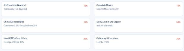 Cars and car parts: 25% for non-USMCA vehicles (15% for EU, Japan, and South Korea).